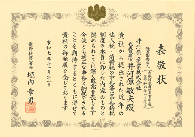 龍野税務署より、1974年以来継続して「優良申告法人」(事業所の0.5%) の表敬状を受ける。